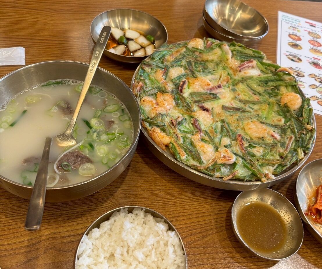 王道の韓国グルメは制覇したい、ということで、チヂミとコムタンスープを食べに「육전국밥 성수역점」というレストランへ。聖水駅4番出口を出て30mほど直進したことろにある、24時間営業のチェーン店風なお店です。タッチパネルで注文でき、店内も広く、カジュアルで明るい雰囲気でした。