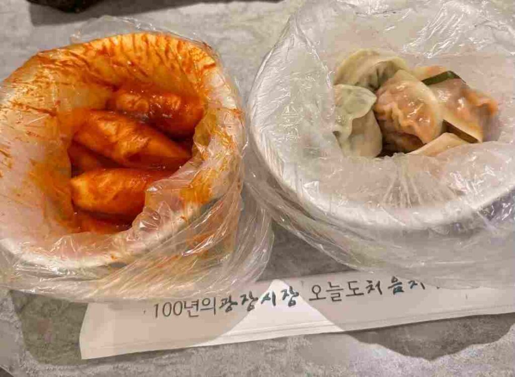 トッポギとマンドゥをテイクアウトで注文しました。トッポギは中央の鍋の下段で茹でてから、上段のソースを絡めて提供されます。マンドゥはノーマルなものとキムチ入りがありました。プラスチックカップと袋に入れて、お箸ももらえるので、持ち帰ってホテルで食べることもできます。