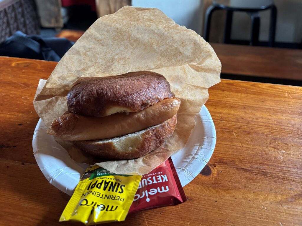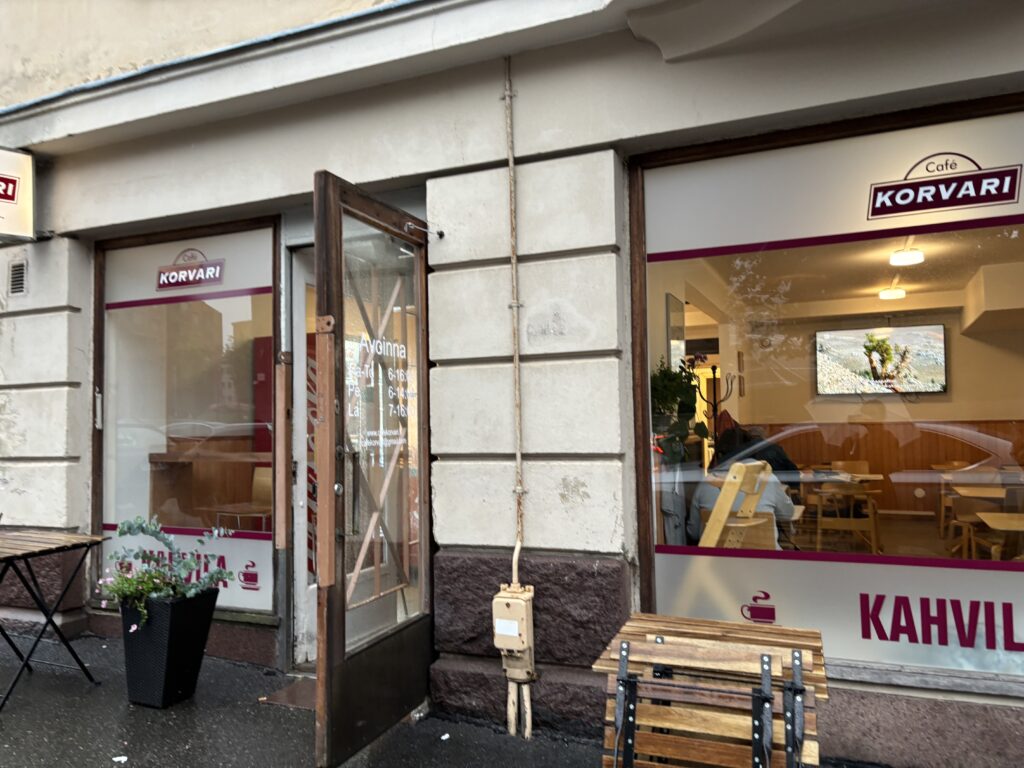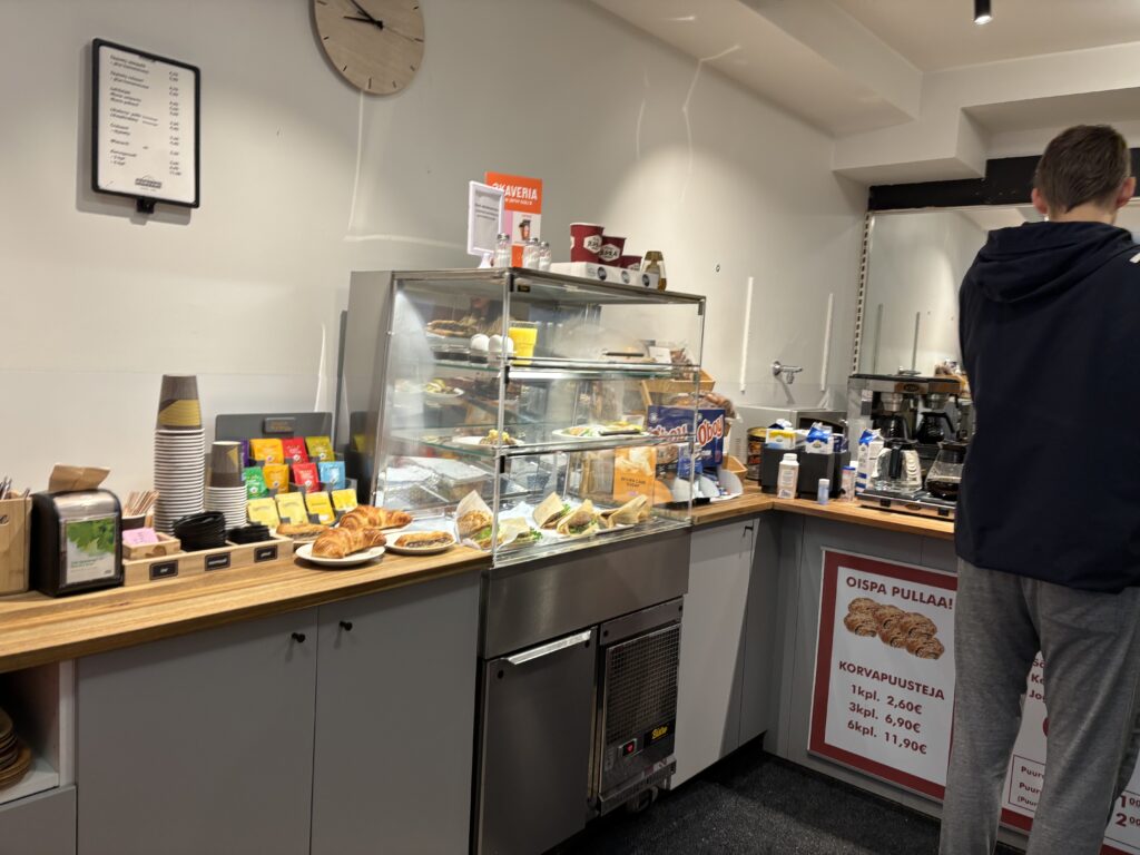 外でソーセージを焼いて食べるのが美味しいようなので、店員さんに聞いたところ「焼いてもいいけど雨降ってるから寒いよ」とのこと。ブルーベリーパイとシナモンロール、コーヒーとベリージュースを注文しました。この後、ミートパイ(オールドマーケット付近のベーカリーEromanga Oy(エロマンガ)の名物)を追加注文。