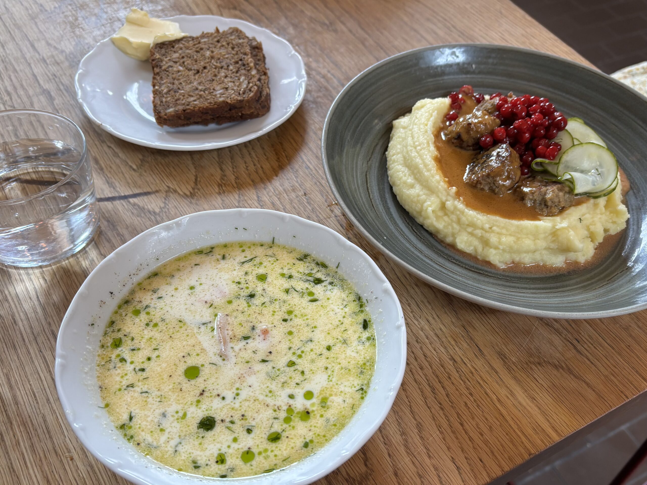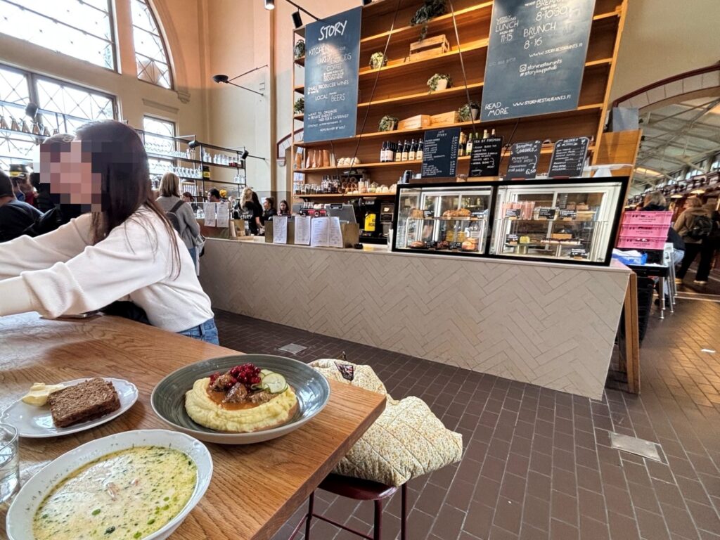 ランチはオールドマーケット内にあるSTORYというお店へ。サーモンスープとトナカイ肉ミートボールを目当てに行きました。メニューには記載がありませんでしたが、サーモンスープはハーフサイズを注文できました。ライ麦パンも付いてくるので十分なボリュームです。