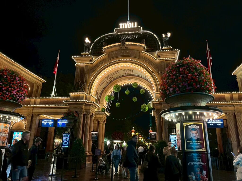 私たちがチボリ公園に着いたのは22時。この時間でも来場者は多く、アトラクションも動いていました。施設全体がライトアップしているため、遊園地らしい雰囲気も感じられます。