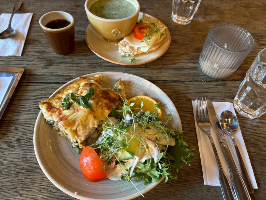 注文したのは本日のスープ(ハーフサイズ)とベジタリアンラザニア。スープにはパン、ラザニアには野菜が添えられていました。